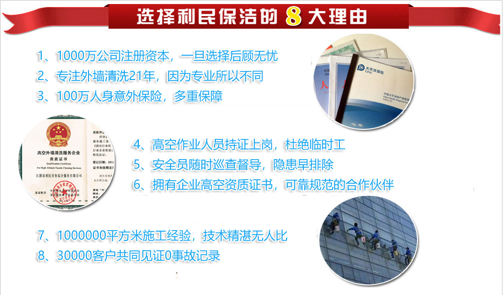 我們的外墻清洗業務包括:外墻清潔、外墻防水補漏、外墻涂料粉刷、LED樓體亮化工程高空安裝、外墻防水工程高空施工等系列高空作業項目,是物業公司、景觀工程公司、廣告公司、建筑、安裝公司、幕墻公司、各企事業單位等最佳高空作業服務專業供應商.專業安全高效,承包高空外墻清洗,.專業的施工團隊,所有人員均持證上崗,高空人員均購買100萬保險,21年1000000平方的外墻清洗經驗,優質的服務..[詳細]